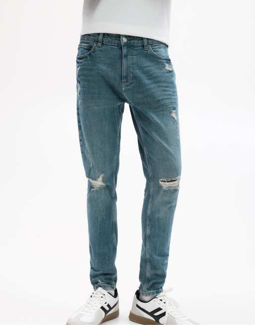 Pull&Bear – Blå, skinny jeans med revor