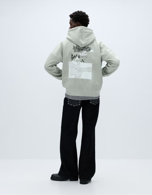 Pull&Bear – Blågrön huvtröja i oversize med tryck