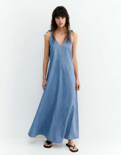 Pull&Bear – Blekblå, lång jeansklänning med smala axelband