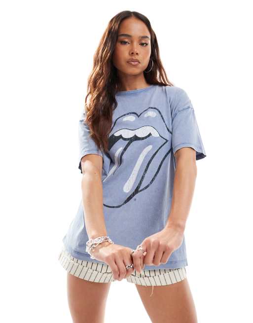 Pull&Bear – Blekblå t-shirt med Rolling Stone-tryck