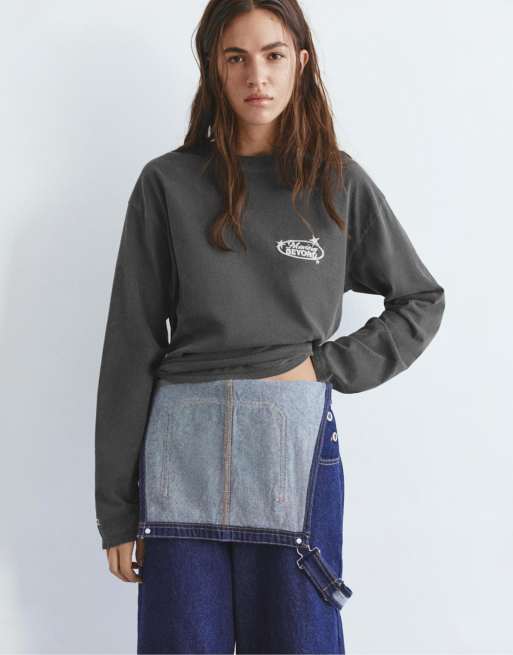 Pull&Bear – Bleksvart t-shirt med långa ärmar och tryck