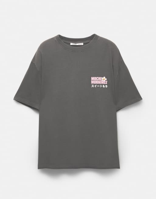 Pull&Bear – Bleksvart t-shirt med mochi-tryck