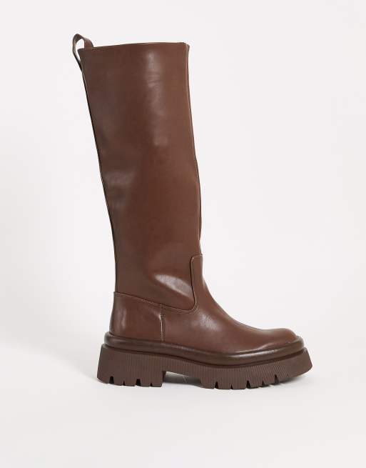 Pull&Bear – Bruna och knähöga, platta boots