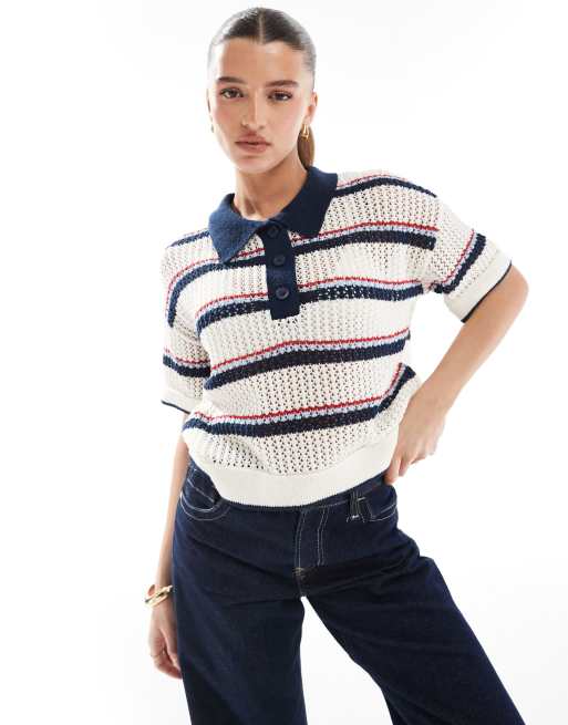 Pull&Bear – Flerfärgad, randig och stickad pikétröja med korta ärmar