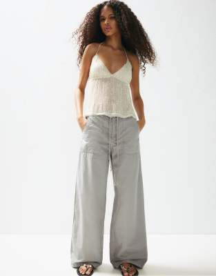 Pull&Bear – Grå, baggy byxor i poplin