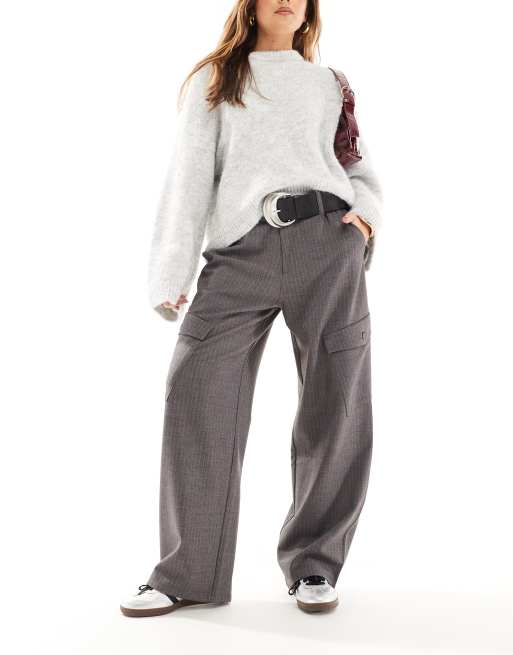 Pull&Bear – Grå, kritstrecksrandiga cargobyxor