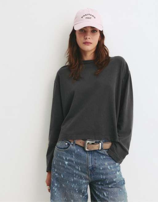 Pull&Bear – Grå, randig t-shirt med boxig passform