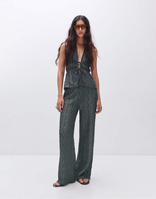 Pull&Bear – Gråaktiga, texturerade byxor med utsvängda benslut