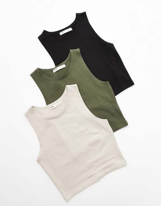 Pull&Bear – Gräddvit, kakifärgad och svart, ribbad crop top med brottarringning, 3-pack