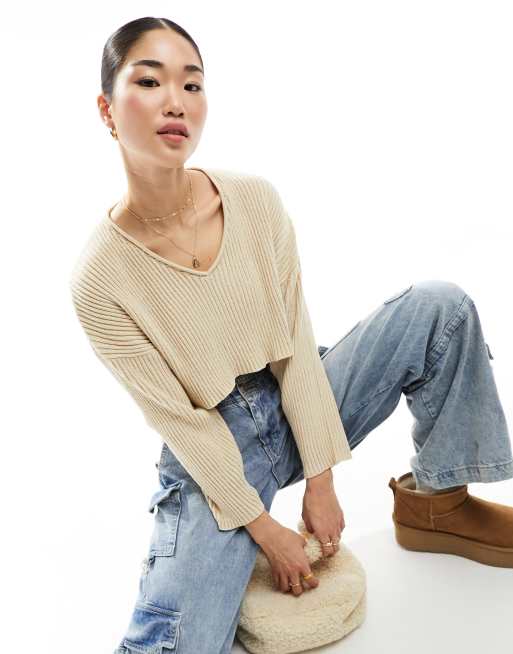 Pull&Bear – Gräddvit, ribbad, kort tröja med v-ringning