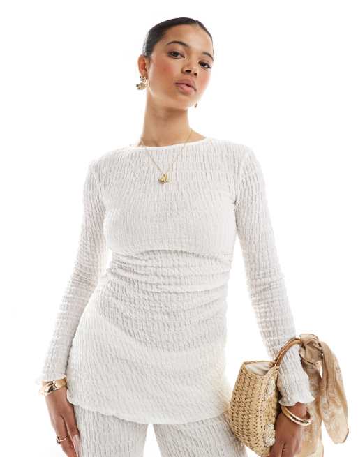 Pull&Bear – Gräddvit, texturerad, asymmetrisk topp med långa ärmar, del av set