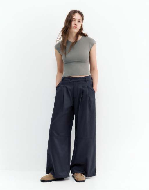 Pull&Bear – Kakifärgad, figurnära t-shirt med vida ärmar