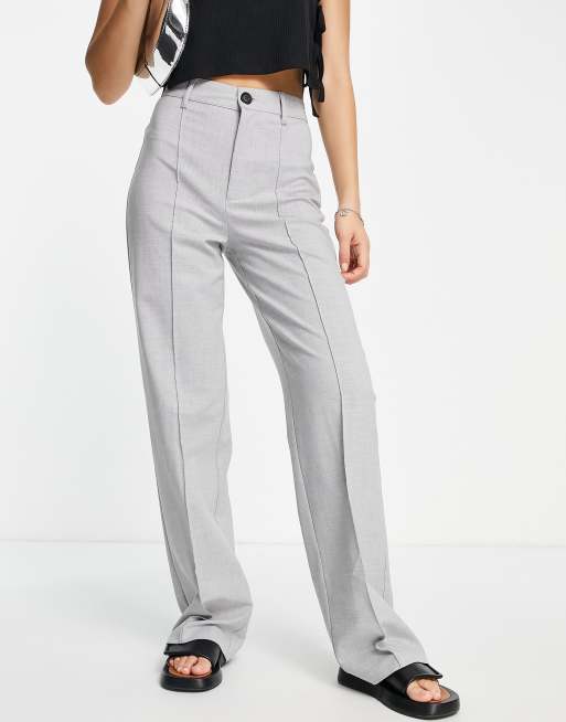 Pull&Bear – Ljusgrå, figursydda byxor med hög midja, raka ben och stråveck