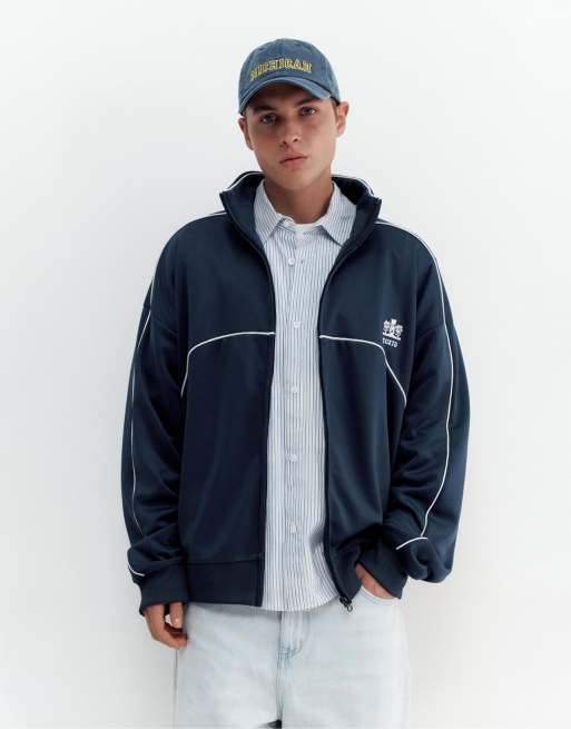 Pull&Bear – Marinblå, broderad jacka med dragkedja