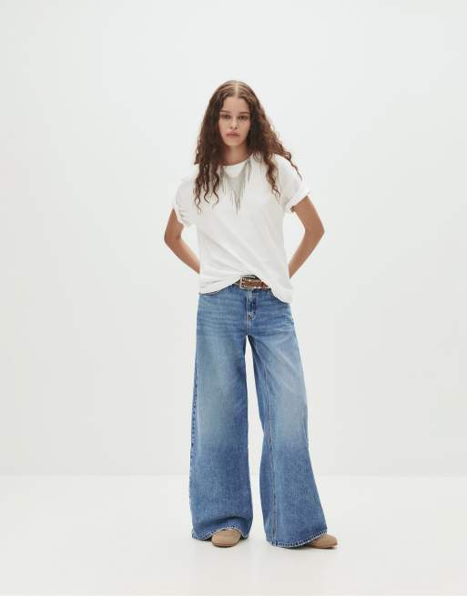 Pull&Bear – Mellanblå jeans med vida ben och låg midja