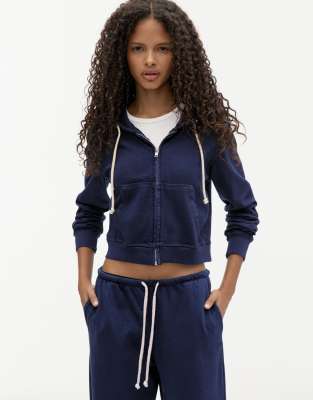 Pull&Bear – Mörkblå huvtröja med kontrastfärgad dragsko