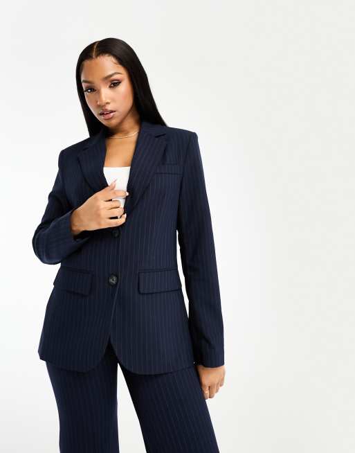 Pull&Bear – Mörkblå, kritstrecksrandig kavaj i oversize, del av set
