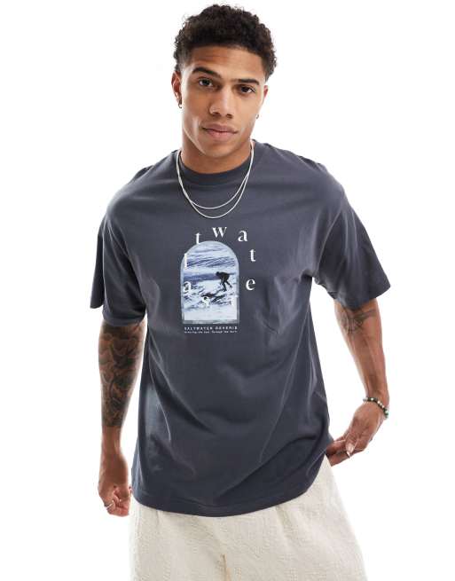 Pull&Bear – Mörkgrå t-shirt med Saltwater-tryck