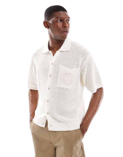 Pull&Bear – Naturvit, finstickad skjorta med broderad ficka