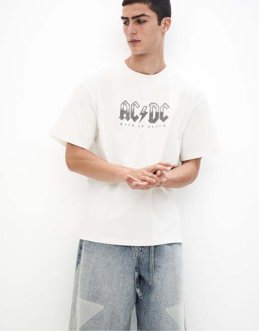 Pull&Bear – Naturvit t-shirt med AC/DC-tryck