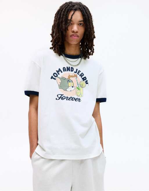 Pull&Bear – Naturvit t-shirt med "Tom & jerry"-tryck