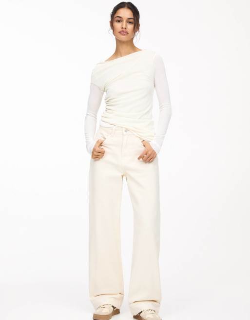 Pull&Bear – Naturvita, baggy jeans med medelhög midja och uppvikt fåll