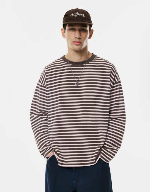 Pull&Bear – Rosa, randig t-shirt med långa ärmar
