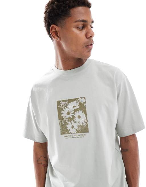 Pull&Bear – Salviagrön t-shirt med blommigt tryck