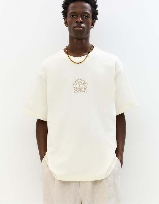 Pull&Bear – Sandfärgad t-shirt med blombroderi