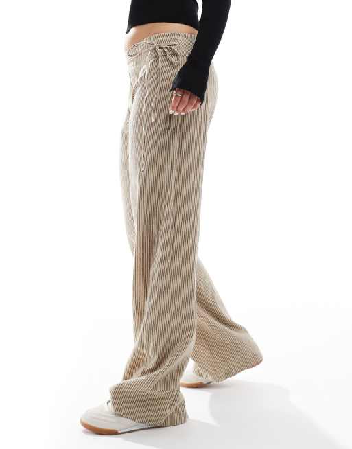 Pull&Bear – Sandfärgade, randiga byxor med knytning i midjan