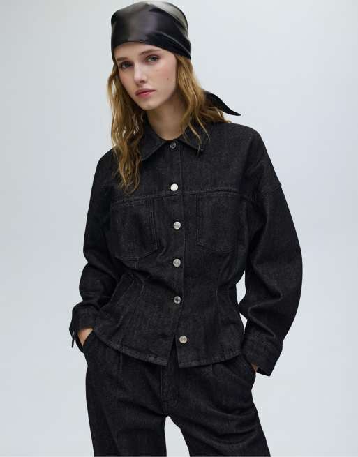 Pull&Bear – Svart, figursydd jeansskjorta med veck