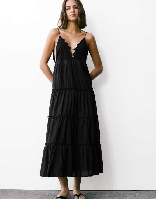 Pull&Bear – Svart midiklänning med broderi och smala axelband