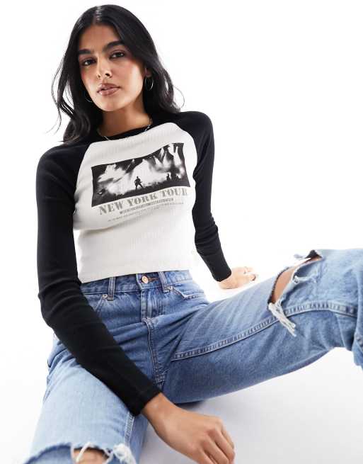 Pull&Bear – Svart och vit, raglan-t-shirt med långa ärmar och tryck