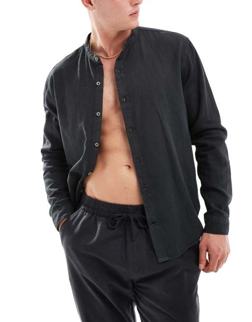 Pull&Bear – Svart skjorta med murarkrage och långa ärmar i linnelook