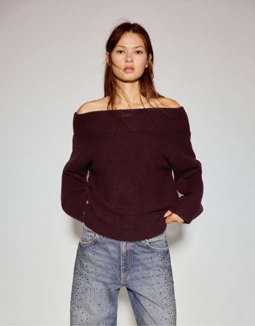 Pull&Bear – Vinröd, mjukstickad tröja med asymmetrisk design