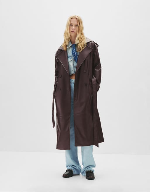 Pull&Bear – Vinröd trenchcoat i läderimitation