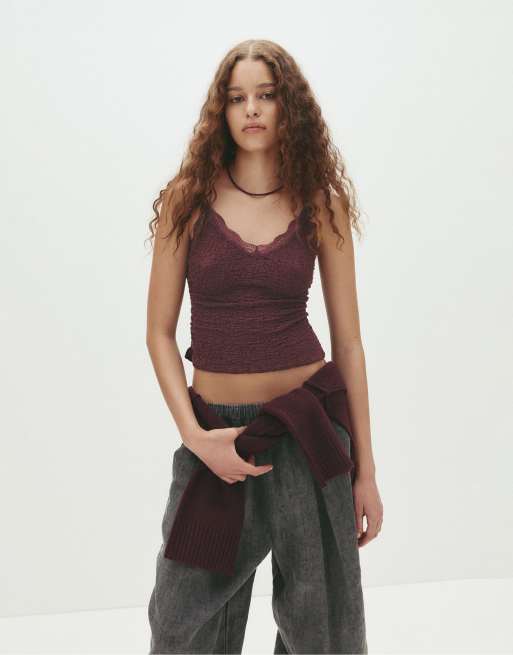 Pull&Bear – Vinrött linne med smala axelband och spetskant