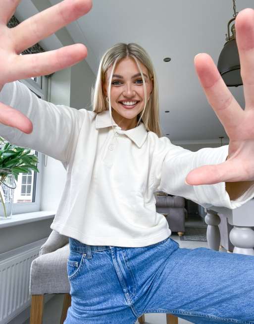 Pull&Bear – Vit långärmad pikétopp i kort design
