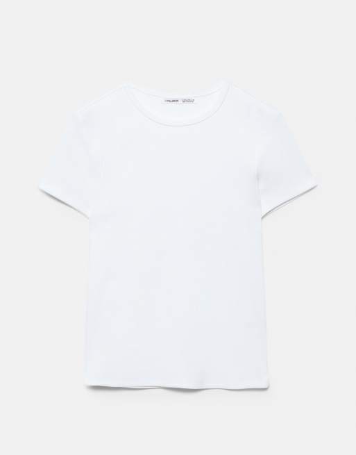 Pull&Bear – Vit, ribbad t-shirt med korta ärmar