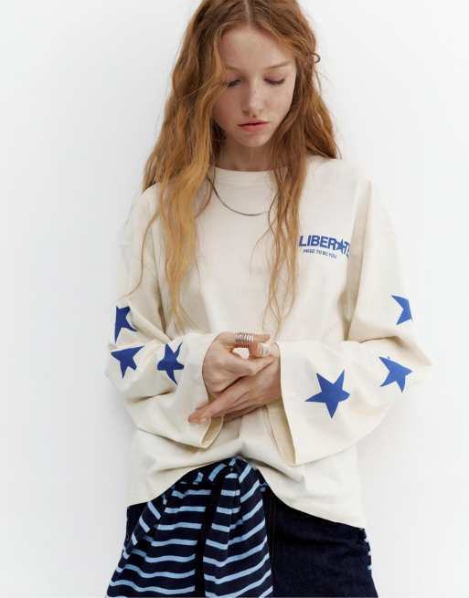 Pull&Bear – Vit t-shirt med långa ärmar och stjärntryck