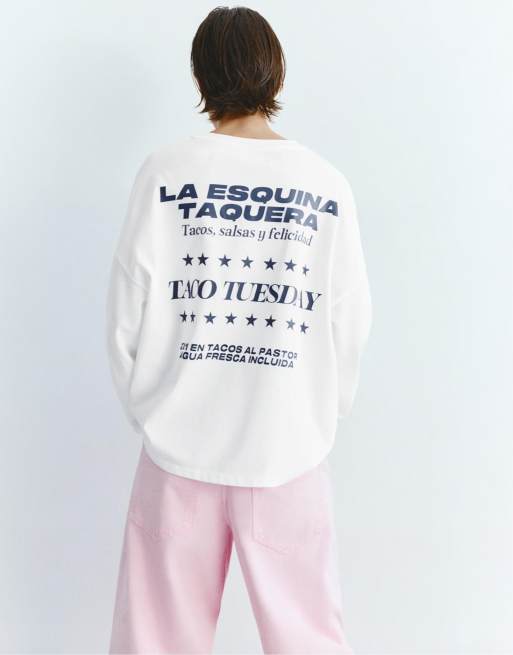 Pull&Bear – Vit t-shirt med långa ärmar och texttryck
