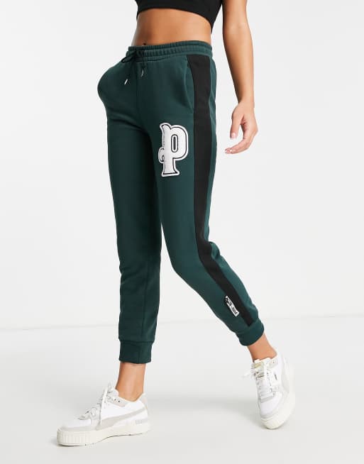 PUMA – Mörkgröna mjukisbyxor i collegestil