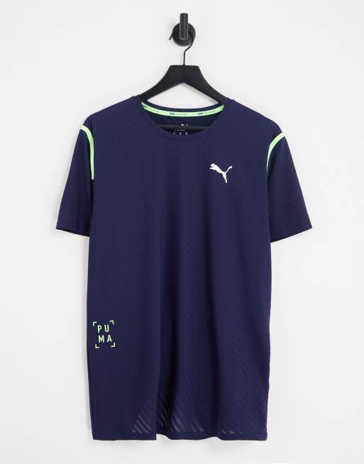Puma – Träning – Marinblå randig t-shirt med gula kantränder
