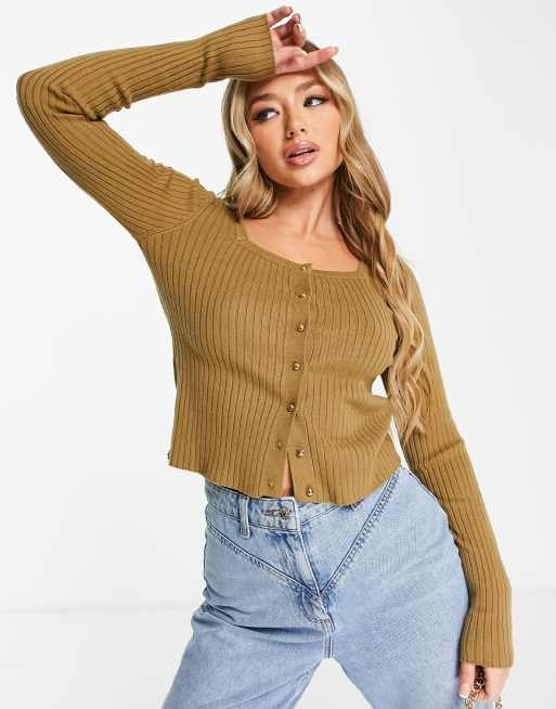 QED London – Olivgrön ribbad kofta med fyrkantig ringning