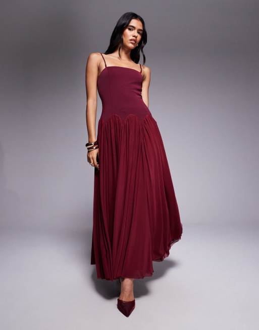 Rare London – Vinröd, plisserad maxiklänning med smala axelband och sänkt midja med uddkant