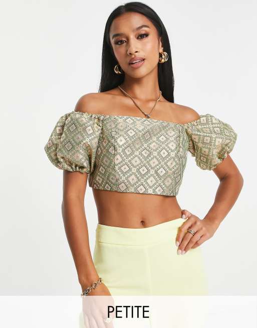 River Island Petite – Guldfärgad topp med puffärmar och bandeau-ringning