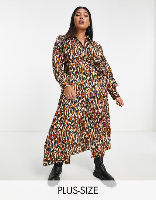 River Island Plus – Brun djurmönstrad midiklänning med omlottdesign