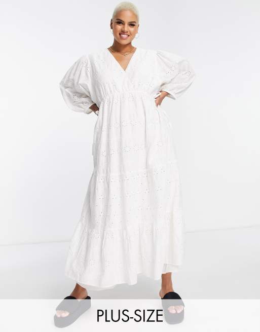 River Island Plus – Vit smockklänning i midilängd med hålbroderi