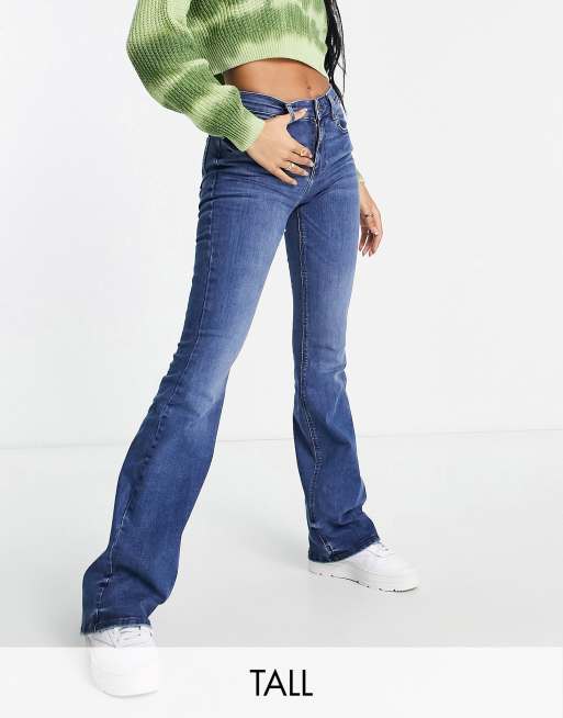 River Island Tall – Mellanblå utsvängda jeans med råskuren fåll