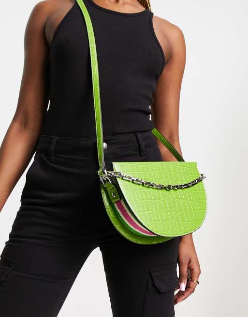 River Island – Grön, krokodilskinnsmönstrad sadelväska med kedja och rosa kantrand